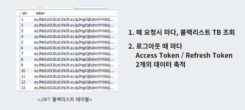 BlackList 전략은 로그아웃시에, Database 에 아예 블랙리스트로 등록해버리는 전략입니다.