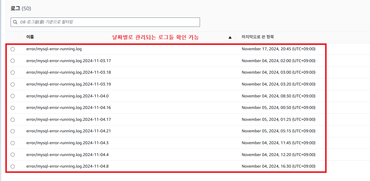 아래와 같이 데이터베이스 - 로그 및 이벤트 탭으로 들어가면 해당 데이터베이스의 로그들이 나열 되어 있는 모습을 볼 수 있습니다.