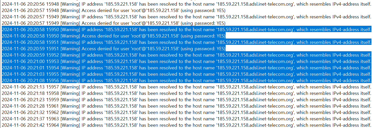 특정 IP 주소(185.59.221.158)에서 약 1~3초에 걸쳐서 지속적으로 비밀번호 대입을 시도한 것으로 보아 brute-force 와 같이 수많은 비밀번호 조합을 시도하여 공격한 듯으로 추정됩니다.