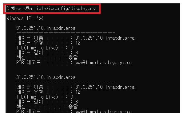 이는 cmd 프롬프트 창에서 ipconfig/displaydns 로 확인이 가능하다.