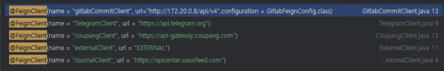 배치 프로젝트에는 이미 4개의 FeignClient가 운영 중이었고, 새로운 GitLab API 연동을 위한 클라이언트를 추가하게 되었습니다.
